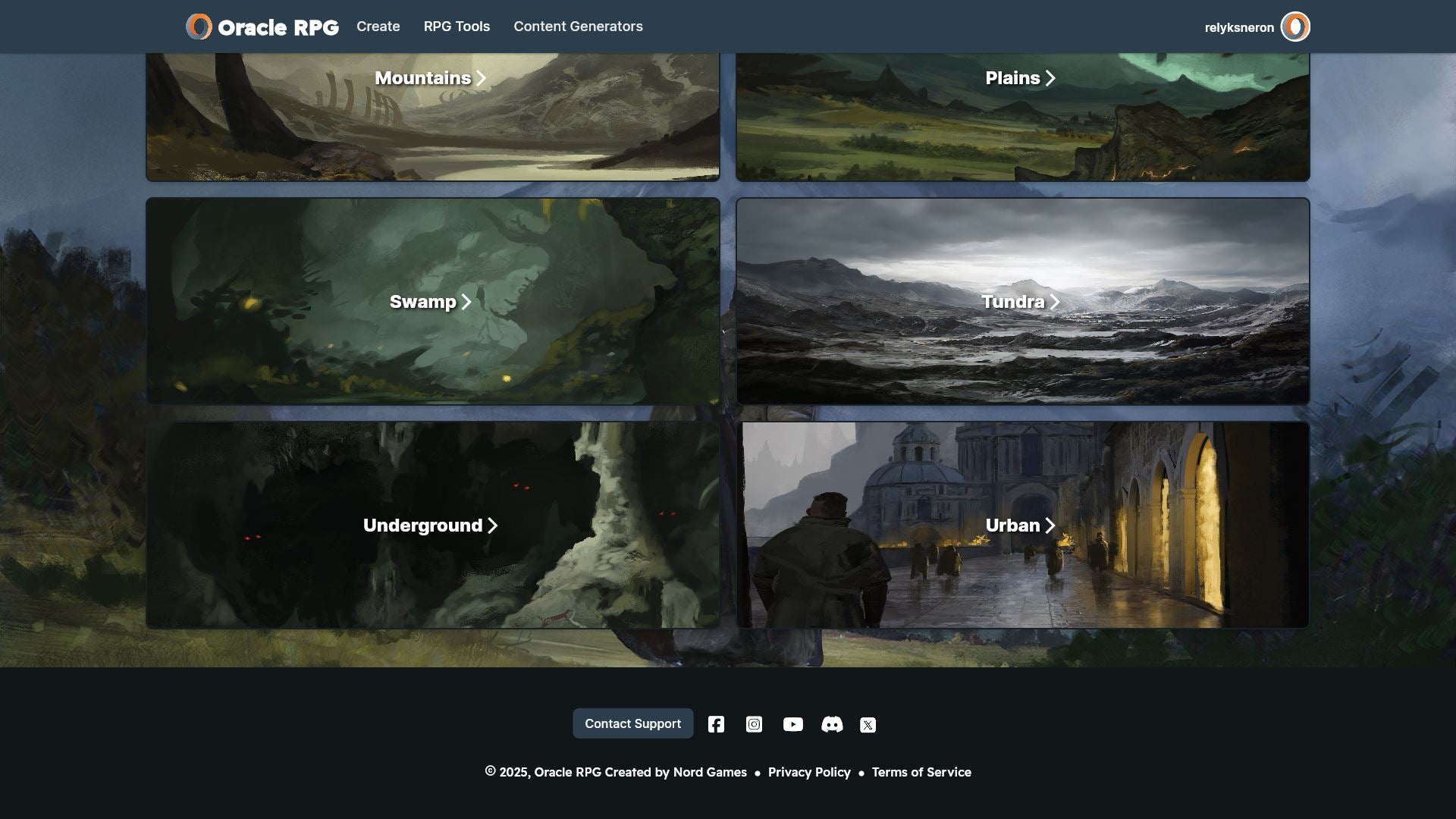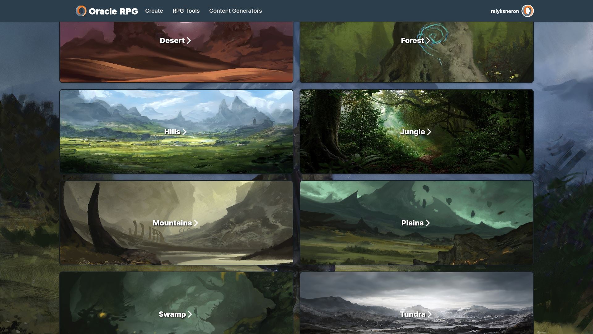 Deserts, Forests, Mountains, Plains, Swamps, Tundra, Underground, Urban, and Waterways