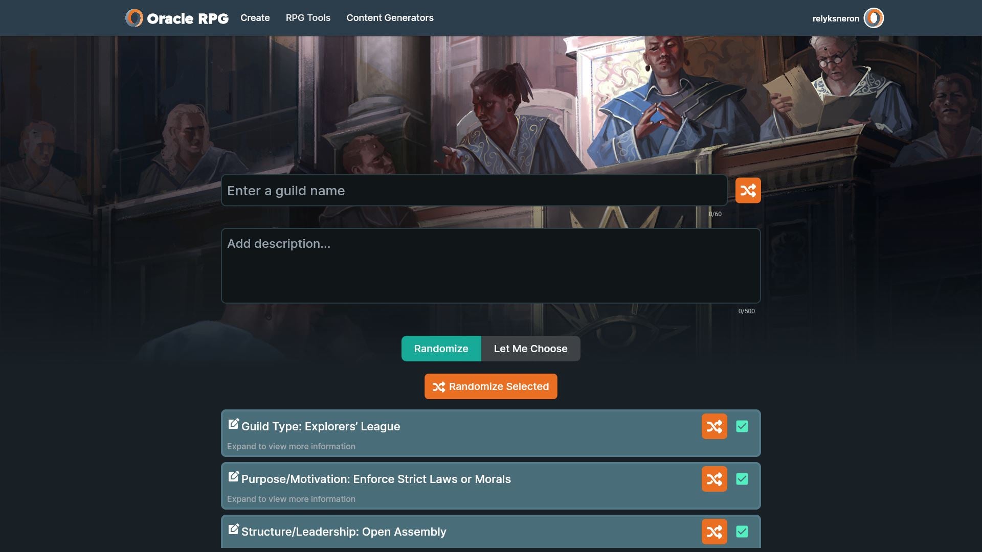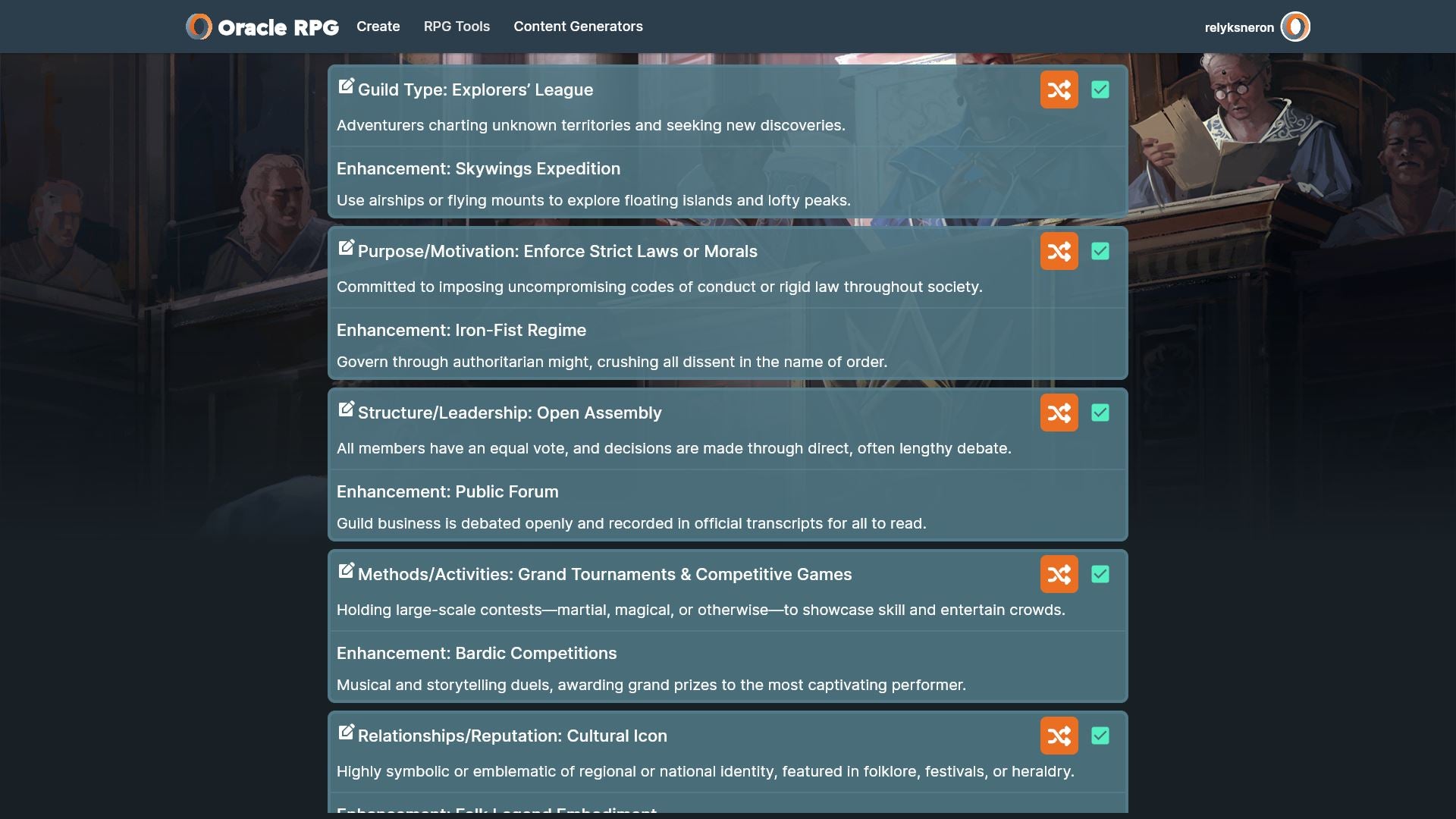The Oracle RPG Guild Generator module transforms Guild making into the click of a button, enabling you to construct fully realized guilds instantaneously. This modular system leverages databases within Oracle RPG with no AI to generate guild type, purpose/motivation, structure/leadership, methods/activities and relationships/reputation on demand! Perfect for GMs seeking rapid world-building without sacrificing depth.