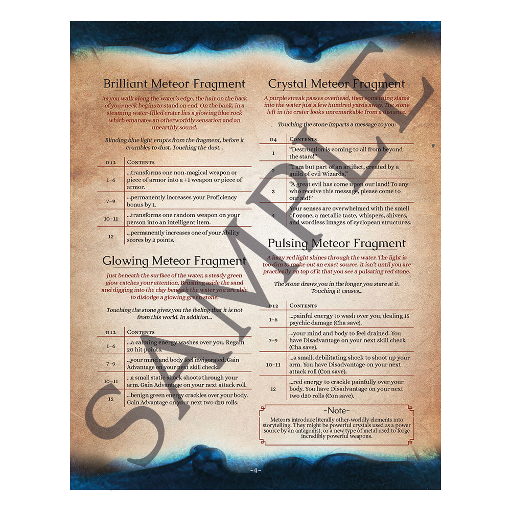 - 50 sets of objects and encounters, each with four potential outcomes for added versatility