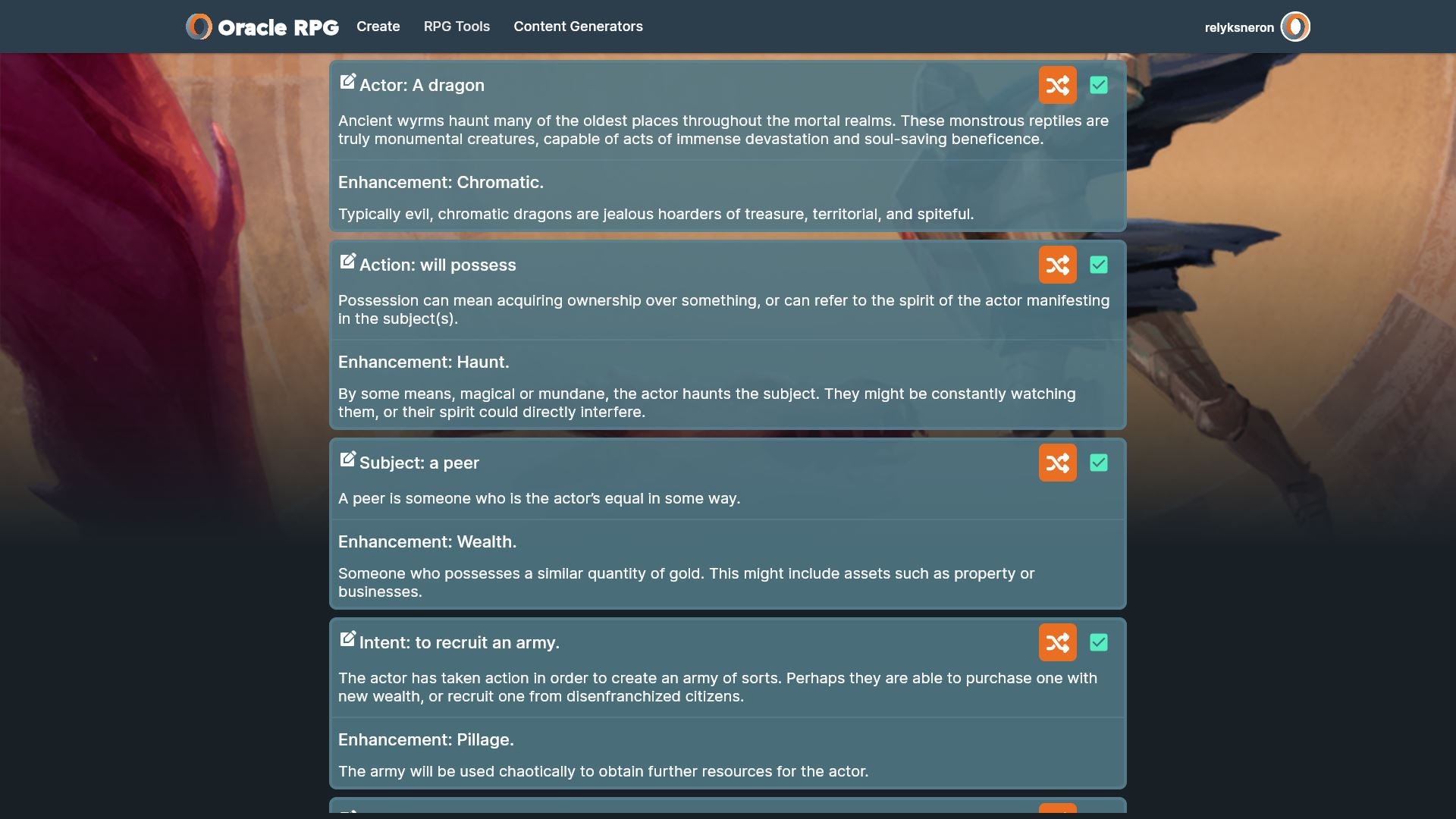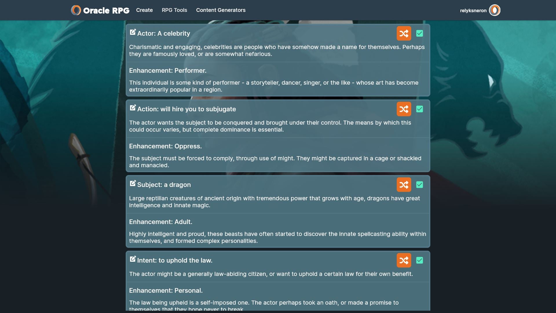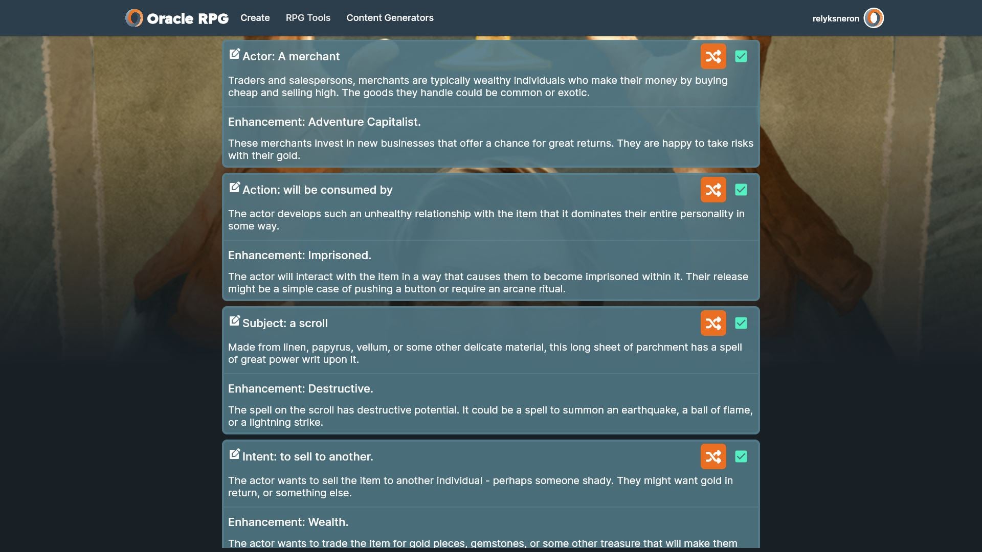 The Story Generator Oracle RPG module is a tool for game masters, storytellers, and writers looking for inspiration when creating fantastic adventures. Its simple and dynamic design allows for maximum versatility and detail in a minimal number of outcomes.