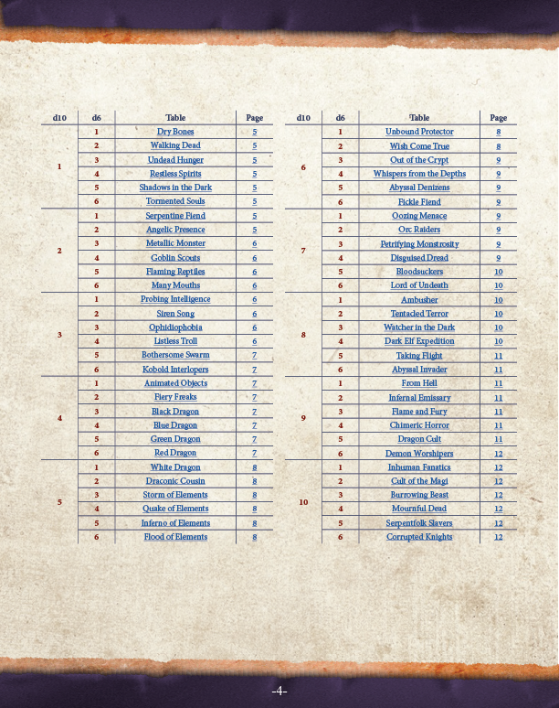 Wandering Monsters takes monsters from the 5th Edition core rulebook and puts them at your disposal in wandering monster tables.