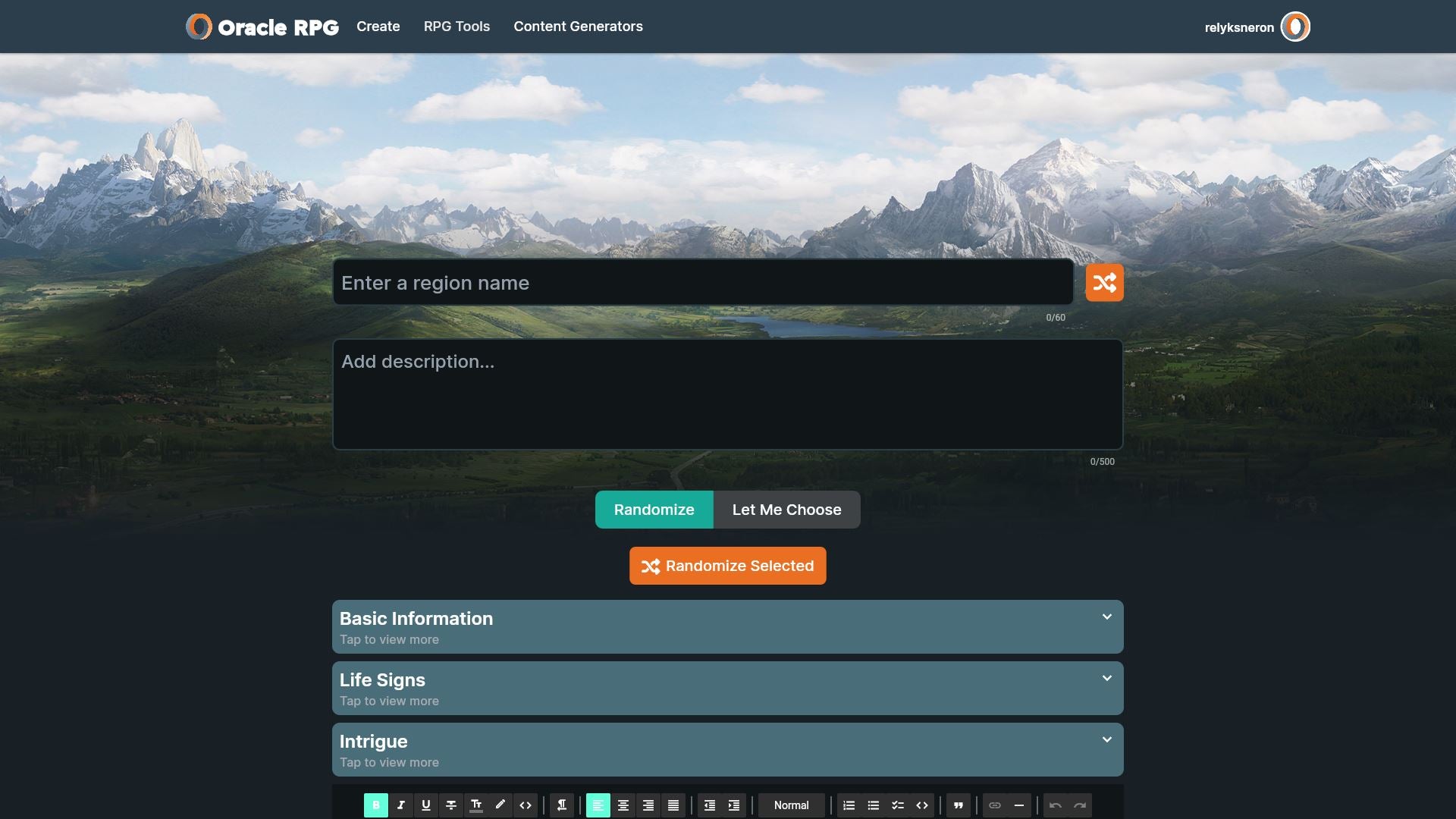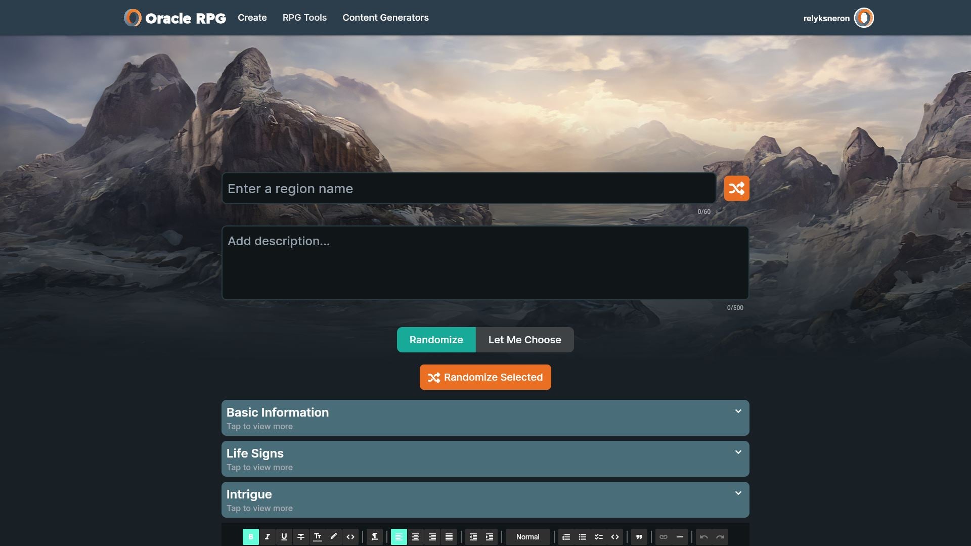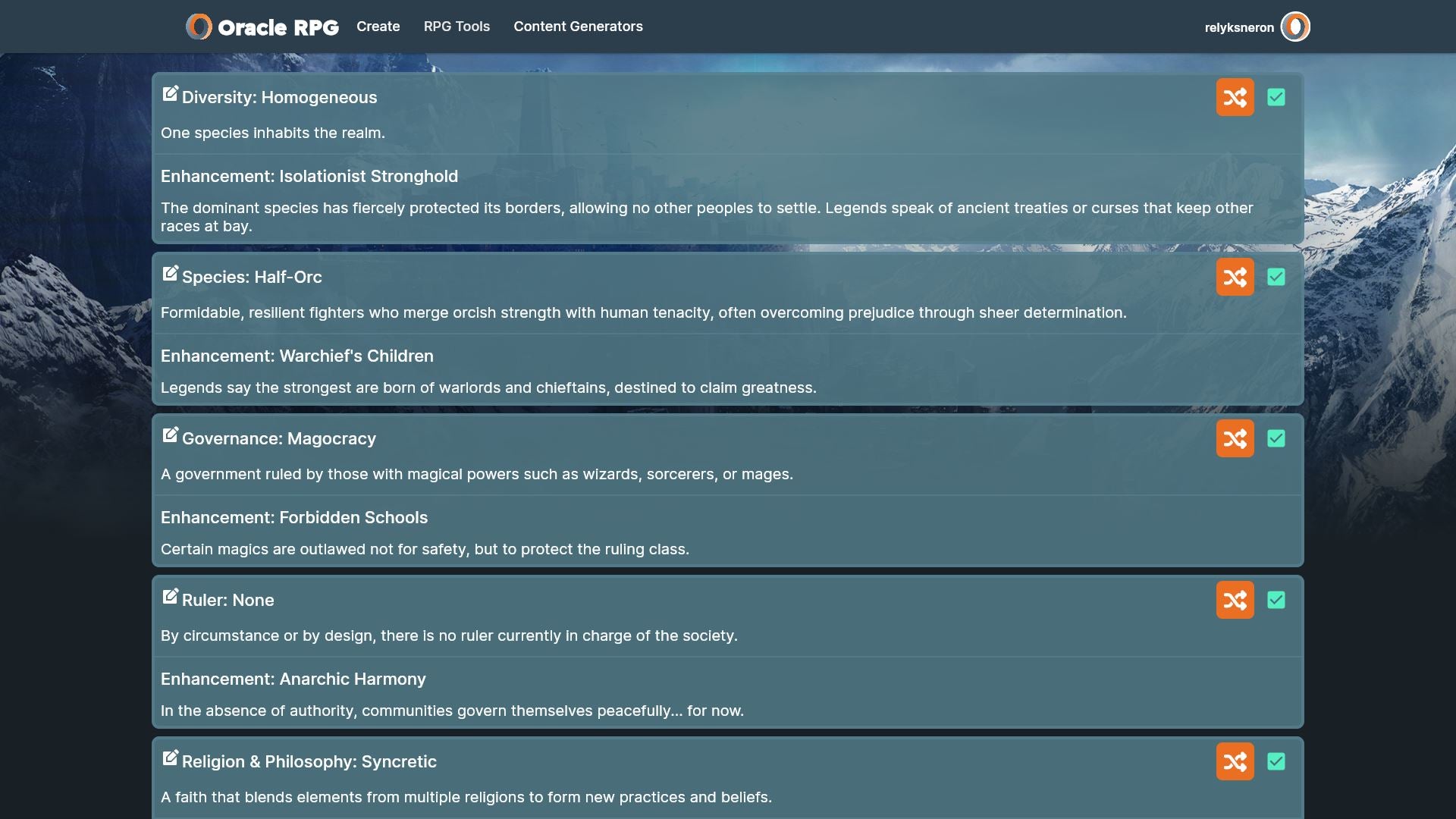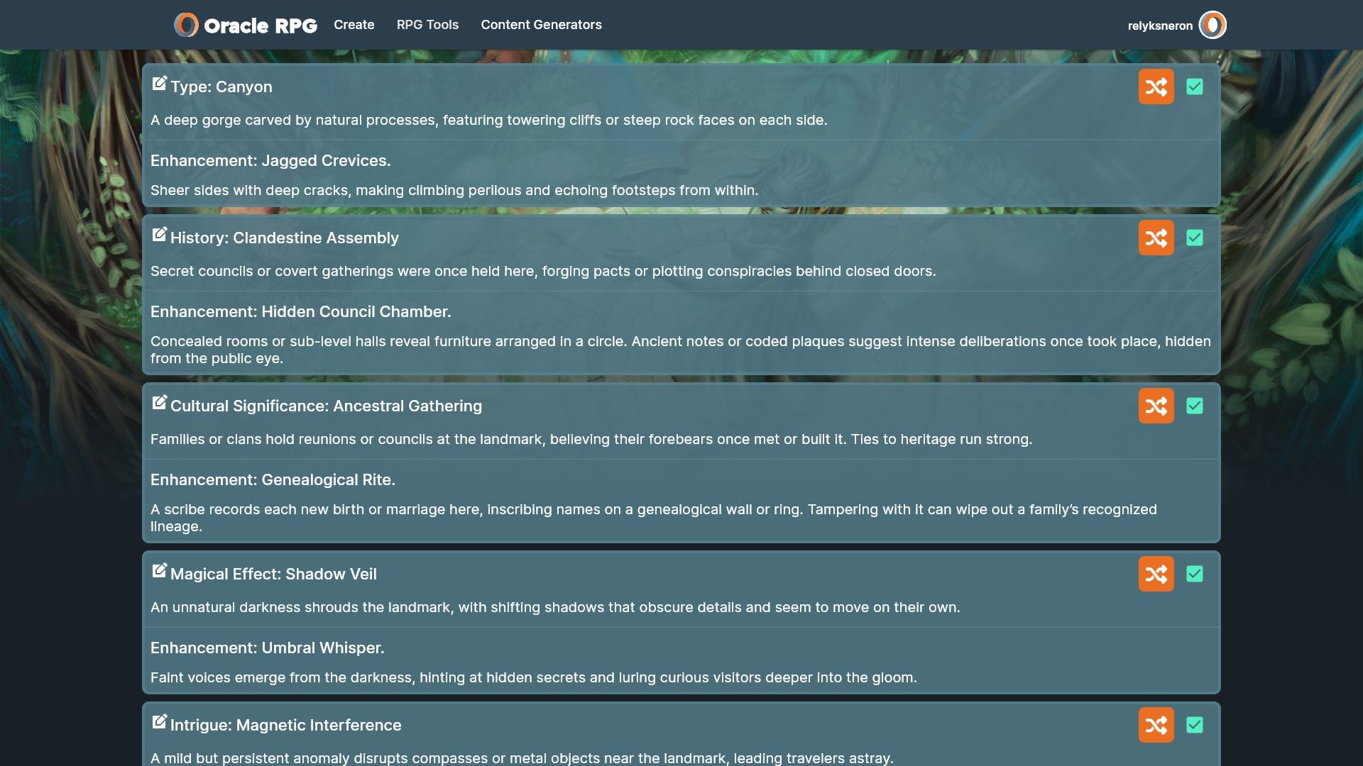 The World Generator Oracle RPG module empowers creators to generate custom worlds complete with unique landmarks, destinations, and immersive realms. This innovative tool streamlines world-building for game masters, authors, and designers seeking rapid, high-quality content generation. Leverage this Oracle RPG module to produce distinctive geographical features, cultural landmarks, and interconnected locations tailored to your creative vision. Whether developing tabletop campaigns, fiction settings, or game environments, this solution accelerates the design process while maintaining authenticity and depth. Essential for professionals demanding efficiency without compromising imaginative scope.